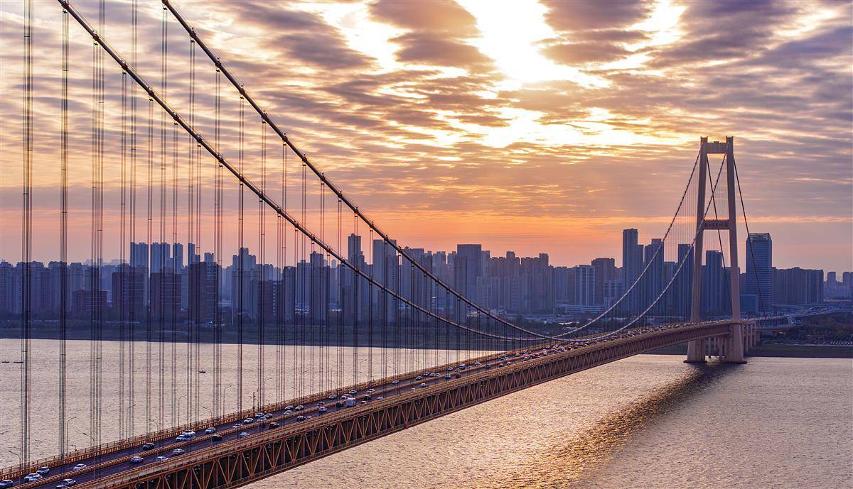 北风吹过,武汉出现晨霞。长江大桥很漂亮。